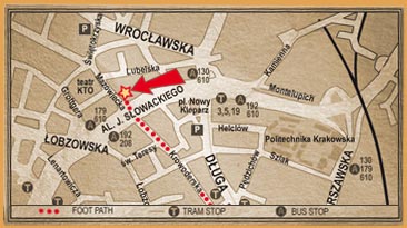 - tramwajem - na przystanku Dworzec Główny wsiąść w tramwaj nr 5 w kierunku Krowodrza Górka. Wysiąść na trzecim przystanku (Nowy Kleparz). Idąc prawą stroną alei Słowackiego, skręcić w drugą przecznicę - ulicę Mazowiecką